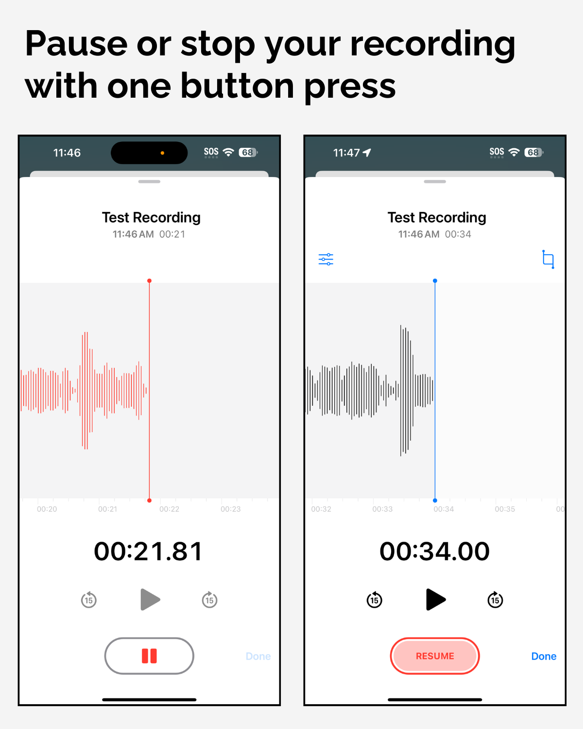 The red button will turn into the pause icon (⏸️) while recording audio and you'll see a waveform of your voice while speaking into the microphone. You'll also see an orange dot in the Dynamic Island located at the top of the screen of iPhone 14 Pro/Max and iPhone 15 Pro/Max while you're actively recording.