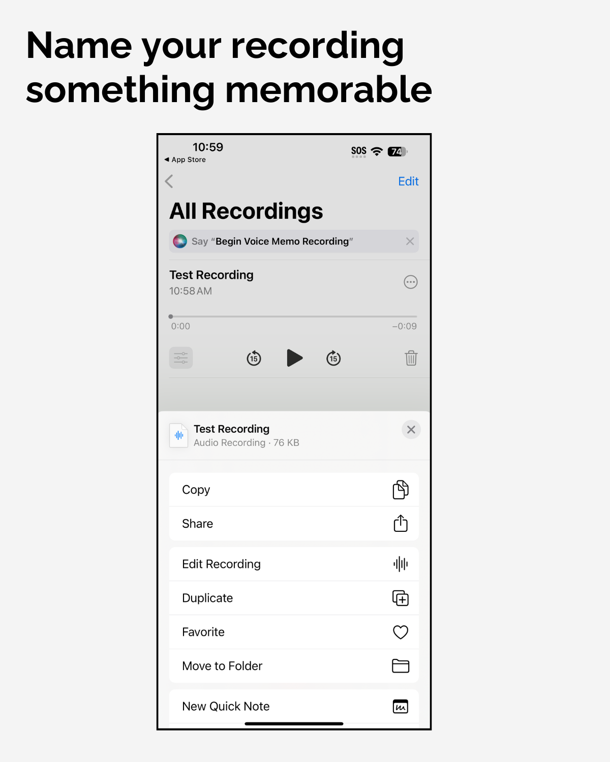 Just tap the name of the recording and a text input will pop up that will allow you to rename the audio file to anything you'd like. Tap "Return" to save your new file name.