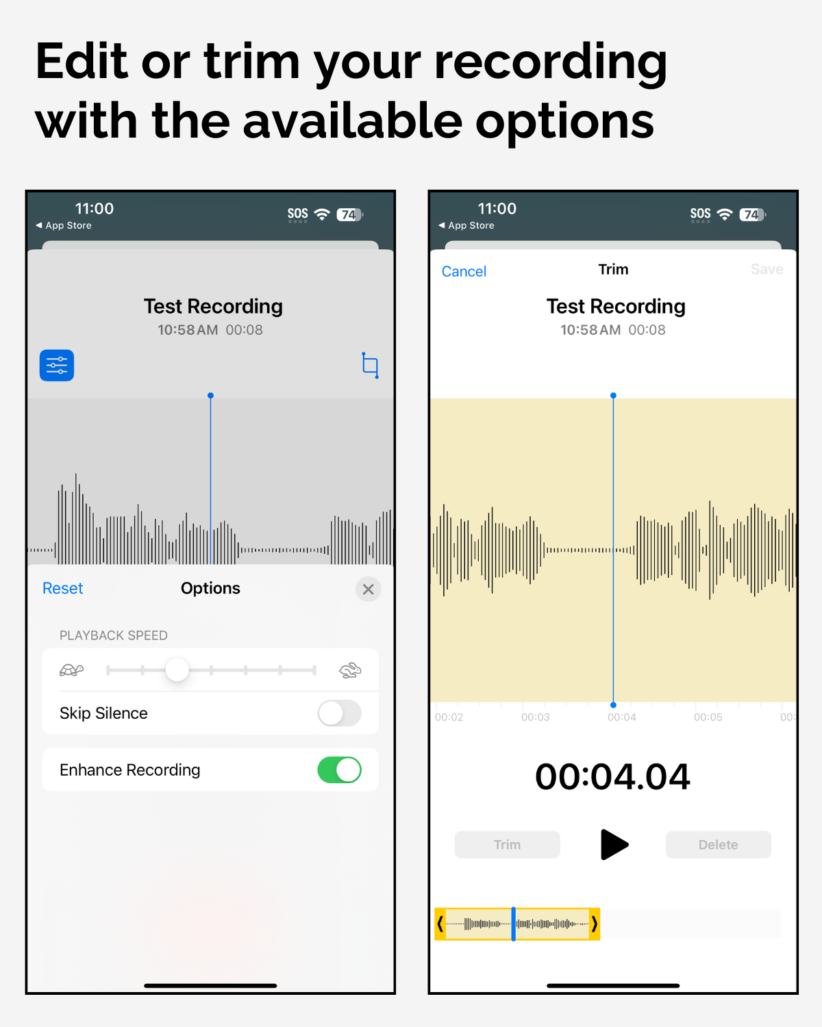 The built-in editing options include audio trimming, playback speed, silence removal, and the ability to enhance your audio. You can also revert the edits you've made to your audio by tapping the "Reset" button to the left of the pop-up.