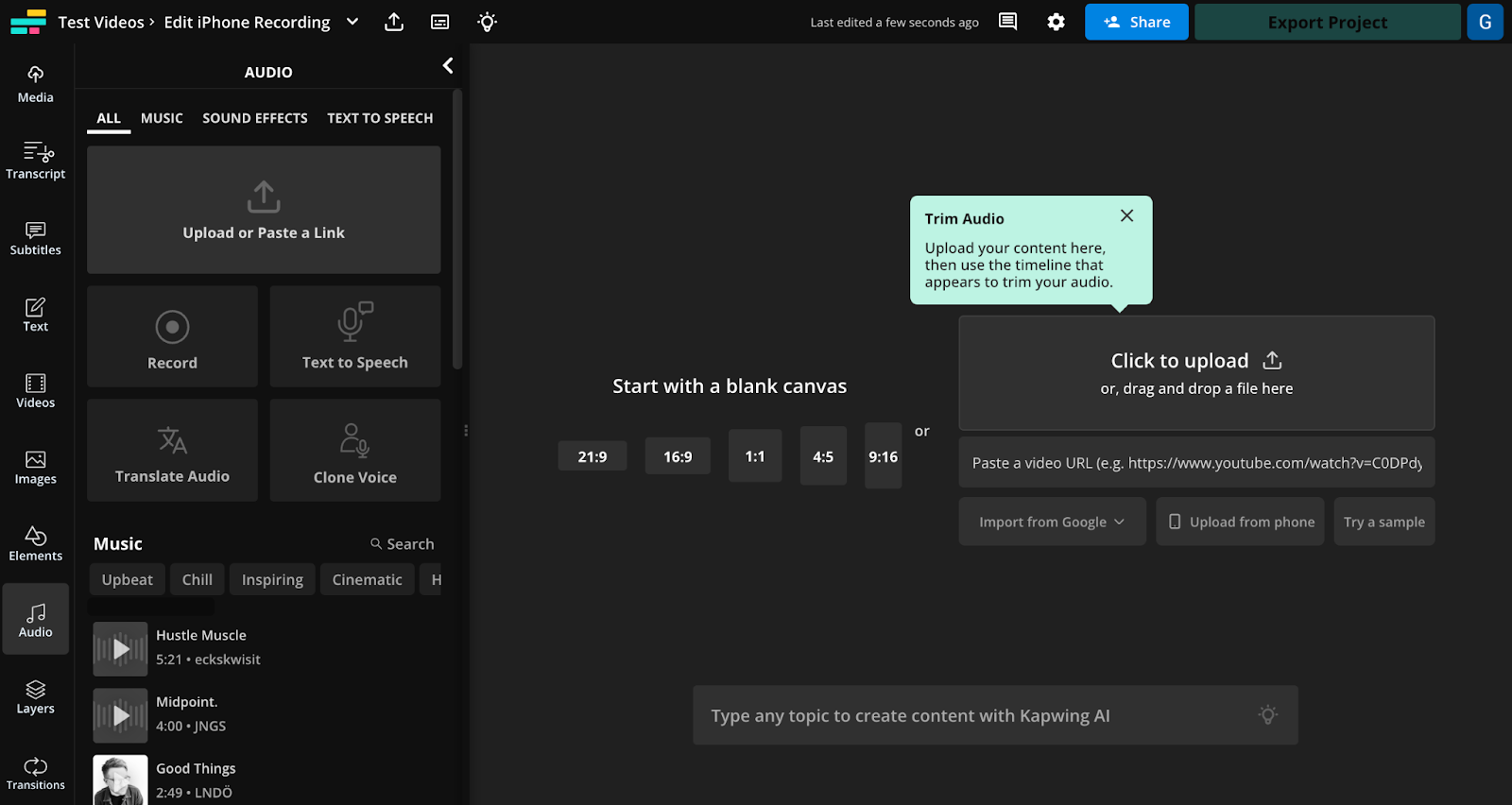 Head over to Kapwing's Audio Editor and click the "Start editing" button to begin. In the editor, select the "Audio" feature from the sidebar and then "Upload or Paste a Link" to upload your audio recording directly or link to the hosted file.