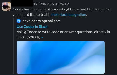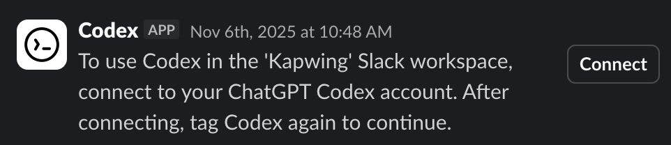 With the Codex+Slack connection, users can start a Codex task by mentioning it in a Slack message that contains enough context to tell it what to do. Codex will kick off a task, linked in the Slack message, and post a message when it has completed.