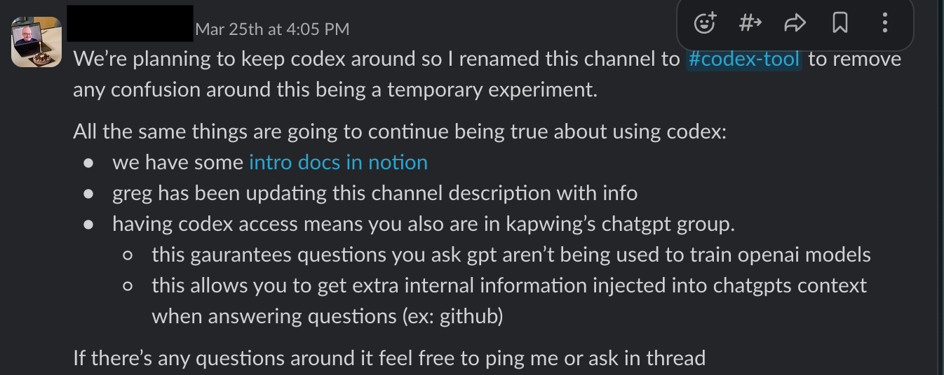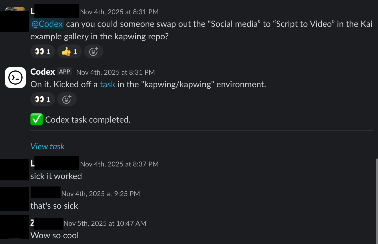 For adoption, the most important early move was to get company leaders building in public. Our engineering lead created a Slack channel for people interested in Codex and wrote documentation in Notion explaining how to use it. Within days, our Head of Product had joined, sent her first requests, and started posting results. Those messages did more to convey Codex’s value than any internal announcement could have. By November 12th, she had merged the first Codex PR into production.