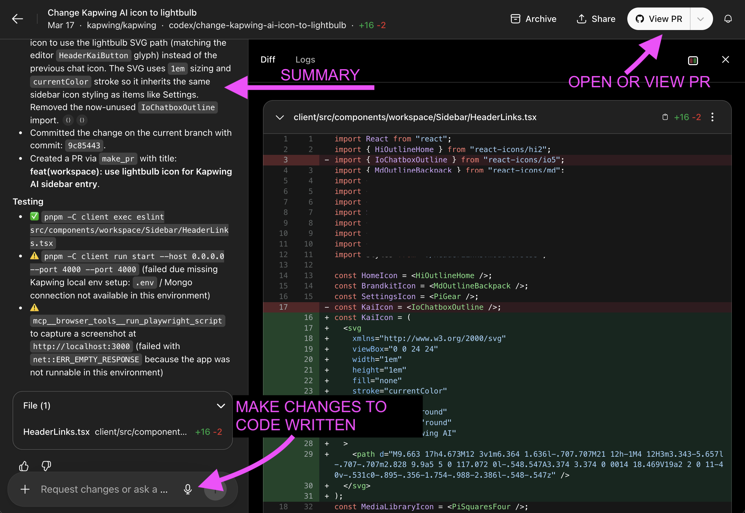 Within the Codex task, you can read a summary of the code changes on the left side and enter prompts if you notice problems when testing. You can also open a Github PR directly or view the existing PR to deploy and test it.