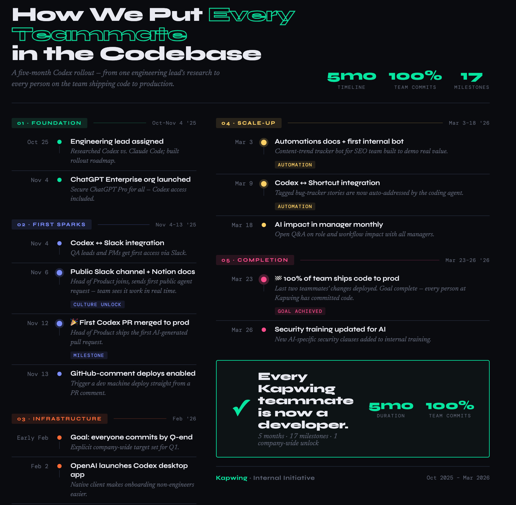 In Q1 2026, every employee at Kapwing committed code to production. Our designer. Our sales lead. Our content writers. Our support reps. We’re a ~25-person company with about a dozen engineers; the other half of the company had never opened a PR before January.