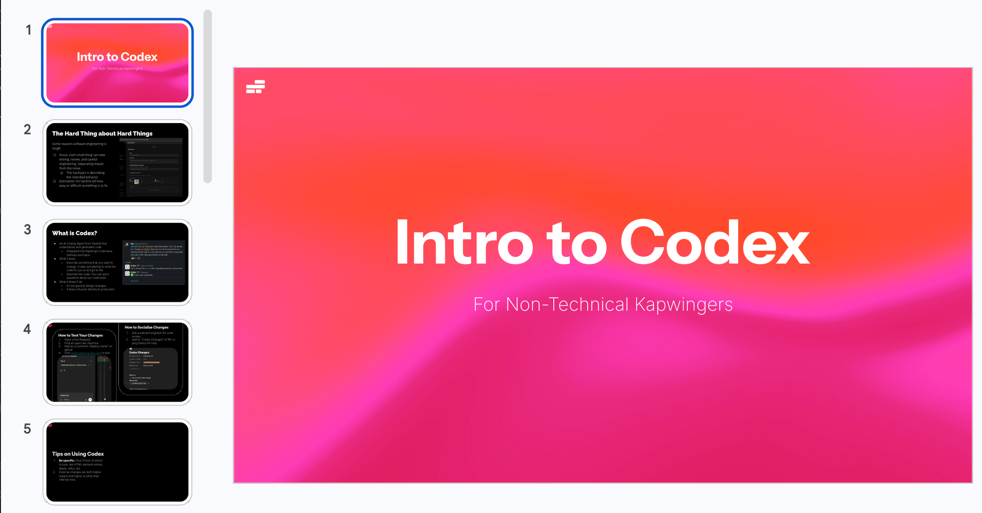 I ran the initial training session for non-technical teammates myself, partly because I wanted to signal that this was a priority and partly because I’d spent enough time using these tools that I could speak to the failure modes. Here the topics that we covered in our Codex training session: