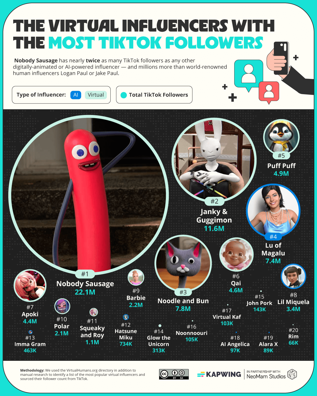 - The biggest AI influencer on TikTok is Nobody Sausage, with 22.1 million followers.