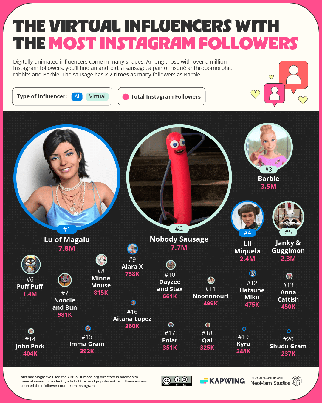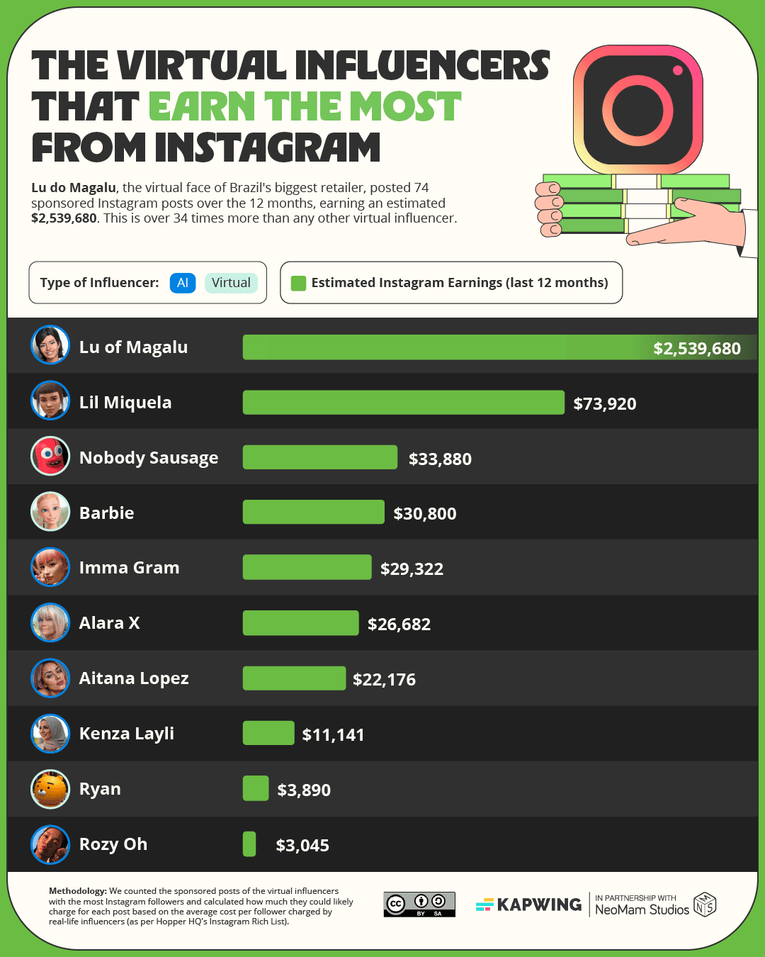 To survey the success and the potential of virtual influencers, Kapwing analyzed the follower counts and potential ad rates of the top social media stars of today and calculated which ones are earning the most money.