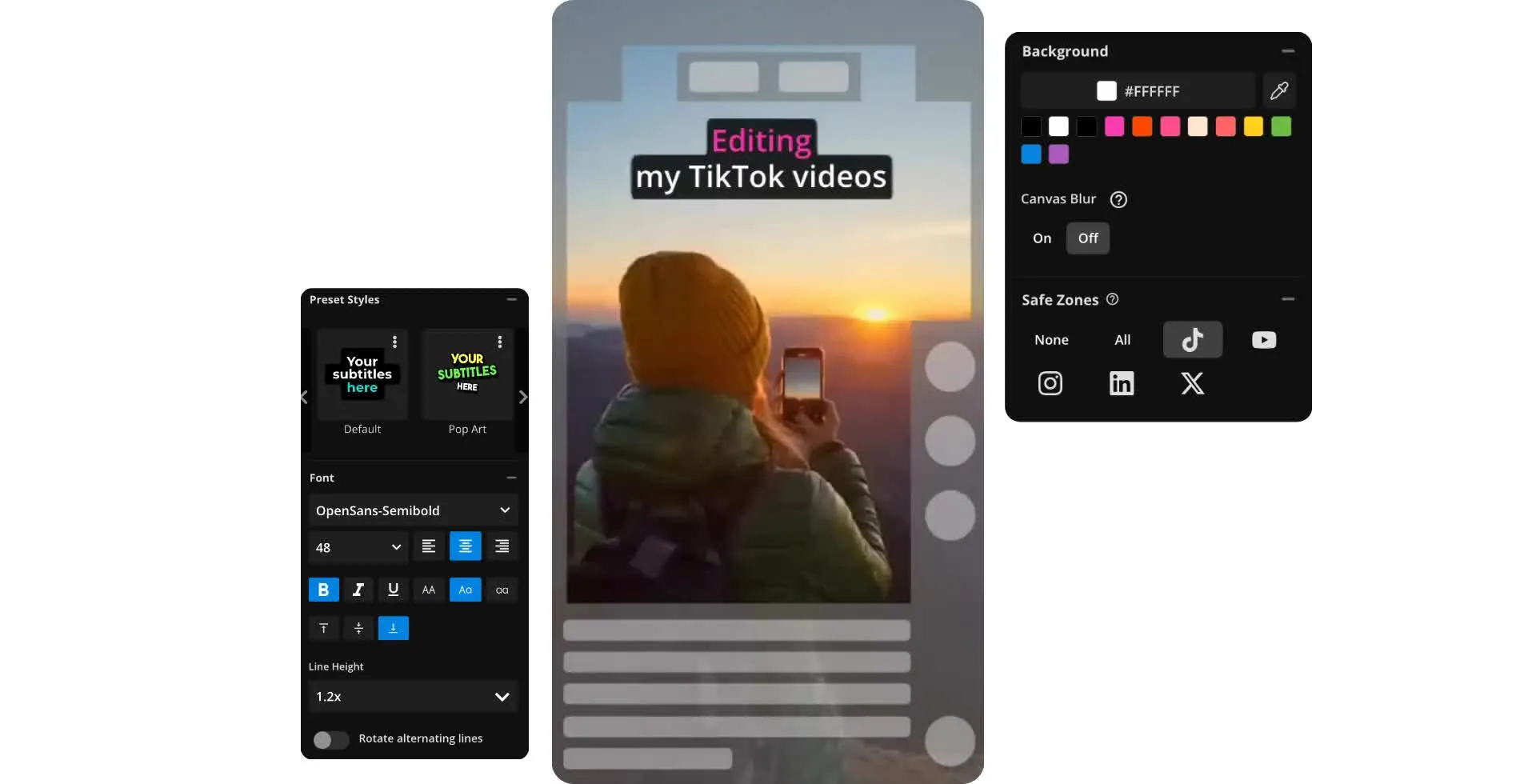 Überlagere TikTok Safe Zones und nutze dann die TikTok Voreinstellung, um dein Video automatisch auf das 9:16 Seitenverhältnis anzupassen. Wende Untertitel, Hintergrundmusik, Filter und vieles mehr an.