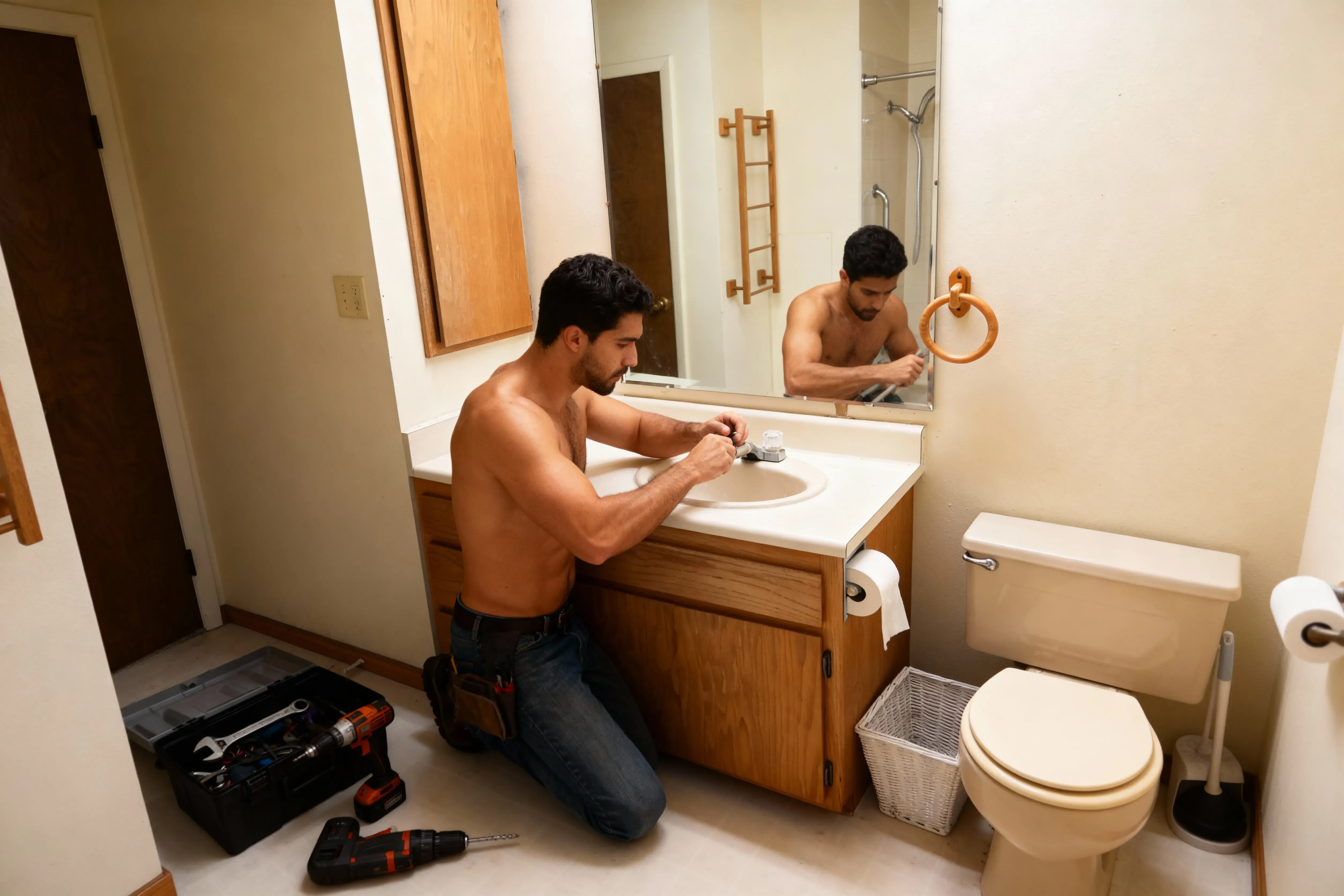 Tómate el pelo a tu novio o compañero de piso con un atractivo fontanero sin camiseta trabajando duro en tu casa
