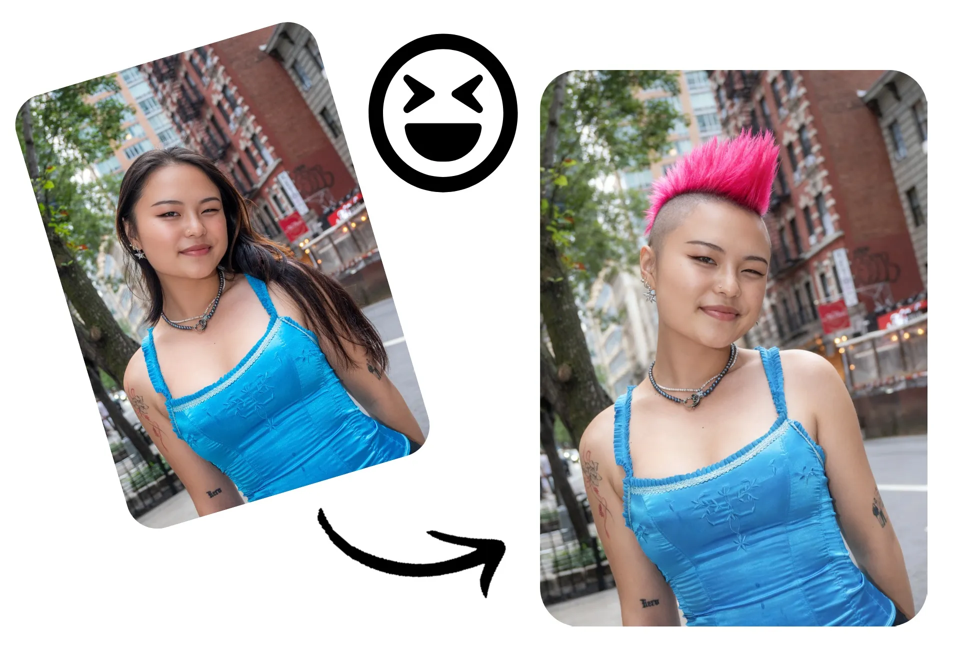 Sorprende a tus amigos o seguidores con un corte de pelo ridículo, un tatuaje nuevo horrible o una fuga fingida. También puedes meter a tus compañeros en outfits divertidos o meterte a ti mismo en cualquier escena, desde un viaje repentino a París hasta un photobomb sorpresa con una celebridad.