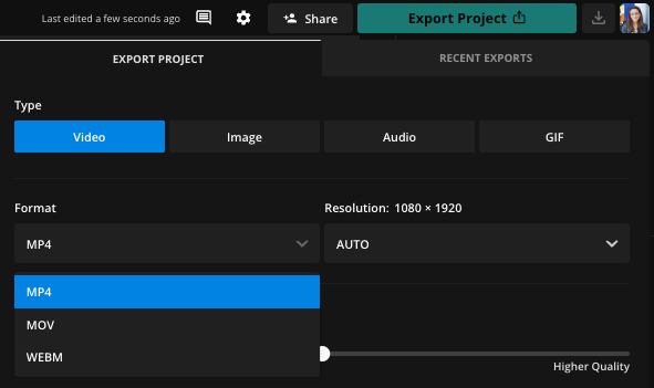 Kapwing's engineering team made major improvements to make project export faster and more reliable. Kapwing also supports selecting the output file type and now supports .WEBP and .MOV export. This gives marketing and creative teams more control over the file type, resolution, and specs of their asset.