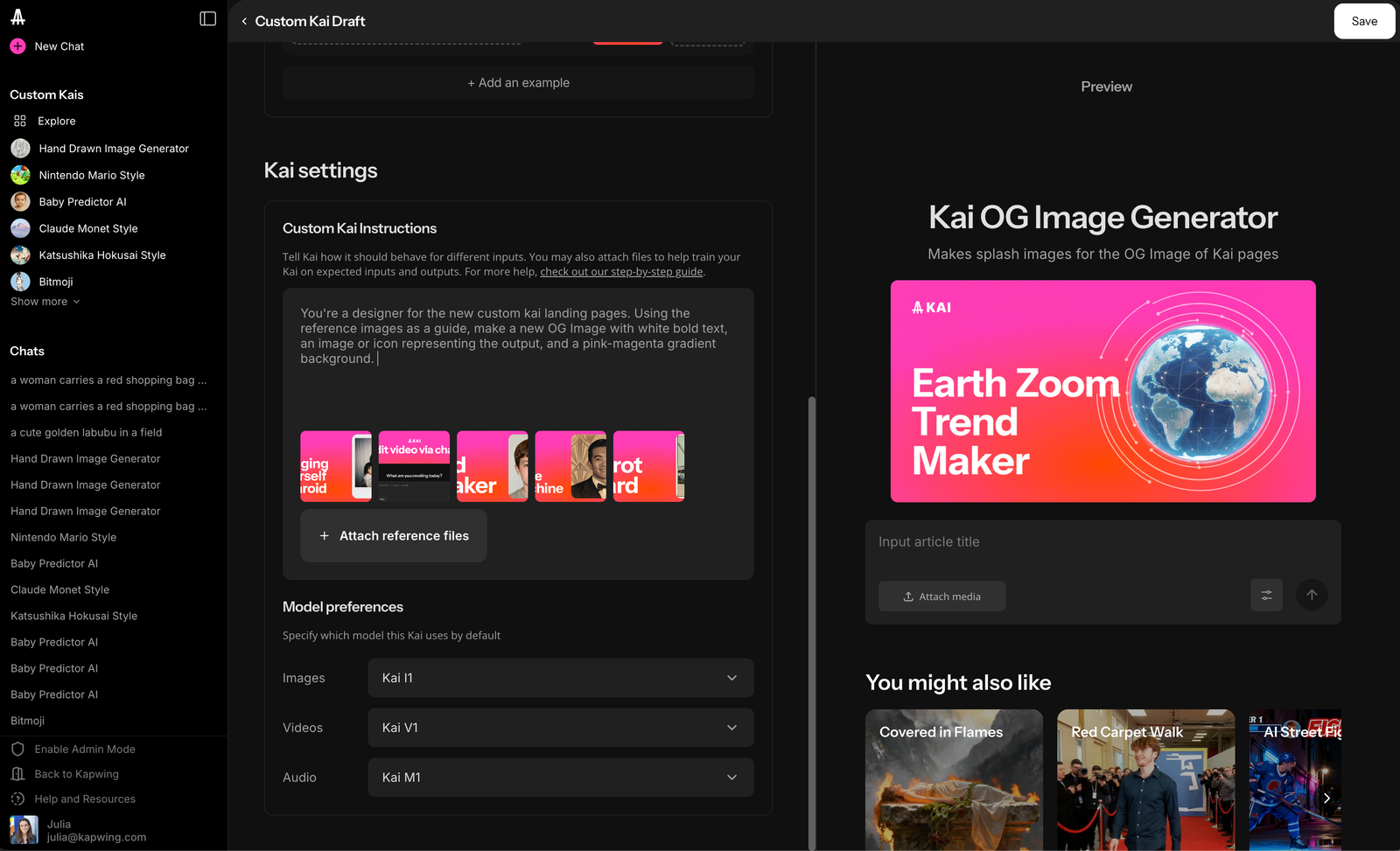 The launch includes Custom Kais, a set of featured pre-configured AI workflows to make trending formats like a selfie with a celebrity, predict a couple's baby, or a gender swap. Brands can use Custom Kais to set up internal formats; for example, we use a team Custom Kai trained on our cover image style to make splash graphics for blog posts.