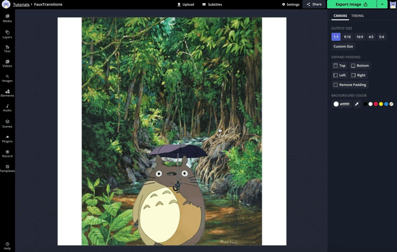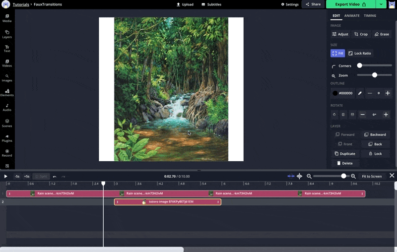2. Follow the same instructions as adding transitions to videos above - find a transition you like, drag and drop it between your image layers, edit, and export!