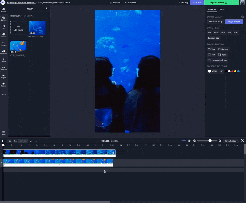 2. Once both of the videos have fully uploaded, in the Timeline editor, arrange the layers so that they're on the same track, if they're not already on the same track. The clips must be side-by-side with no gap in between.