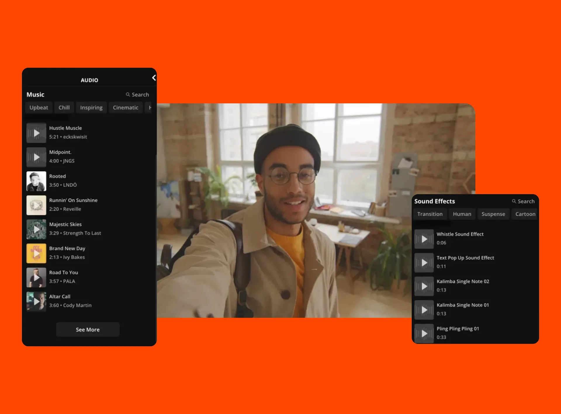 Kapwing का Audio Editor एक फ्री ऑनलाइन म्यूजिक एडिटर की तरह काम करता है — 100+ रॉयल्टी-फ्री ट्रैक्स की लाइब्रेरी से बैकग्राउंड म्यूजिक जोड़ें और साउंड इफेक्ट्स के साथ कॉम्बाइन करें।