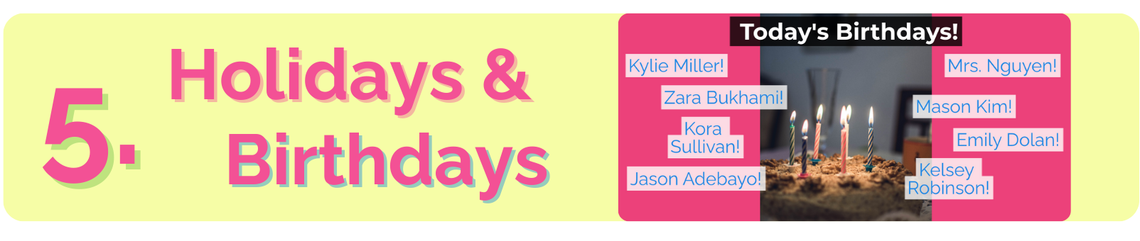 Consider calling out student birthdays and acknowledging holidays in your announcement videos. You can add a text overlay to a video to show everyone’s birthday at one time. Additionally, celebrating a range of important holidays can increase belonging for students. A sense of belonging is heavily linked to students’ overall well-being.