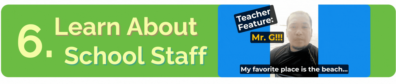 Knowing more about teachers and staff throughout the school can make students feel more connected. Many students don’t feel they have a trusted adult to talk to at their school. Sharing fun personal facts (information about pets, hobbies, favorite or least favorite things, etc) makes it easier for students to relate to adults in the school community. Try highlighting one teacher, administrator, or staff member per week.