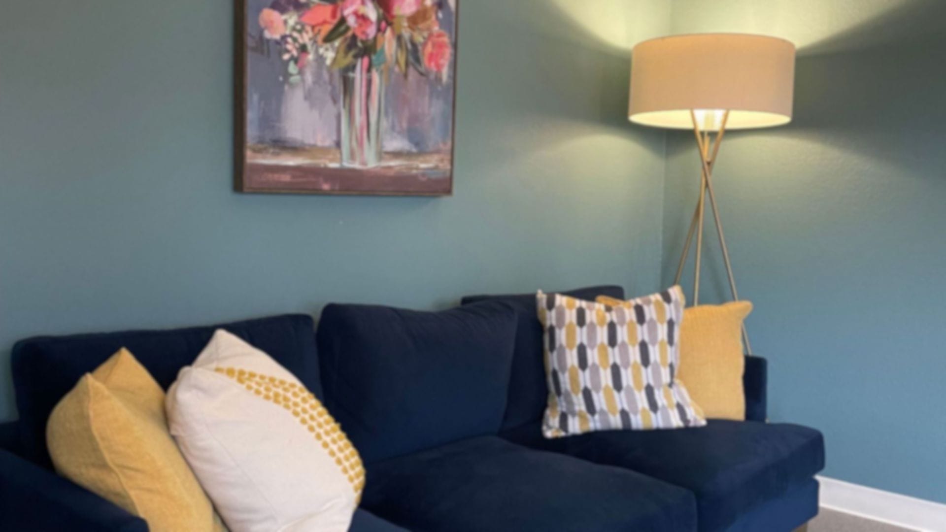 This first one gives your sessions a nice homey feel. It's nice & polished, but the plants and lamps add some comfort to the atmosphere. Plus, the height and angle of the picture are perfect for a virtual background: it really looks like you're in front of a computer camera on top of a desk.