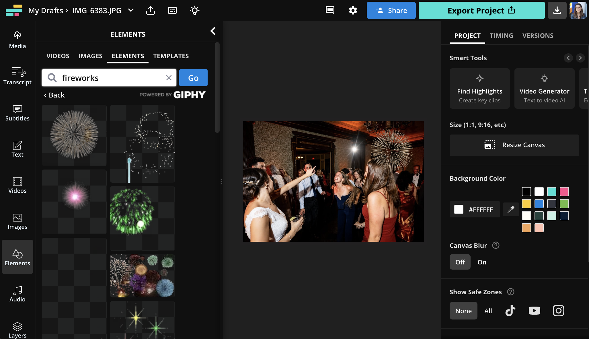 With your background photo or video in place, it's time to add your digital firework layers. The easiest way to do this is to click "Images" and search for a term like "fireworks GIF transparent." You can also open the "Elements" tab to search through Giphy.