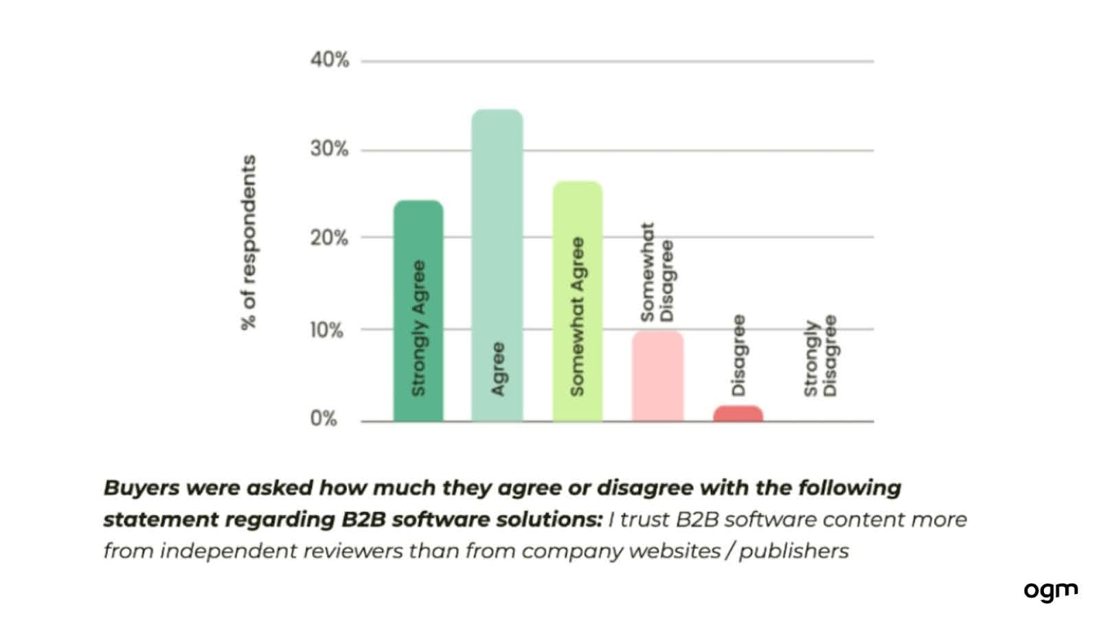 Many users are adding “reviews” or “Reddit” to their search queries. Why? They’re looking for third party validation, which does speak to an inherent distrust of company content. In fact, when asked, 60% of respondents said they trust B2B software reviews from third parties more than content published by companies or traditional publishers.