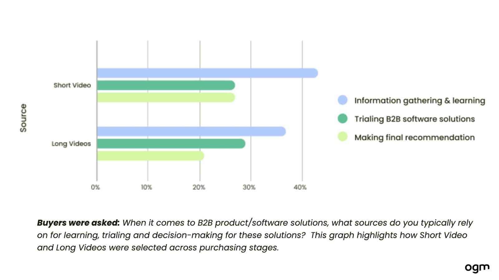 Short-form video is third (after search/company website) for information gathering, while long-form video is second (after free trials) for trialing software. Either way you slice it, video has to be a solid part of your content strategy to help nudge those prospects along in their buying decisions.