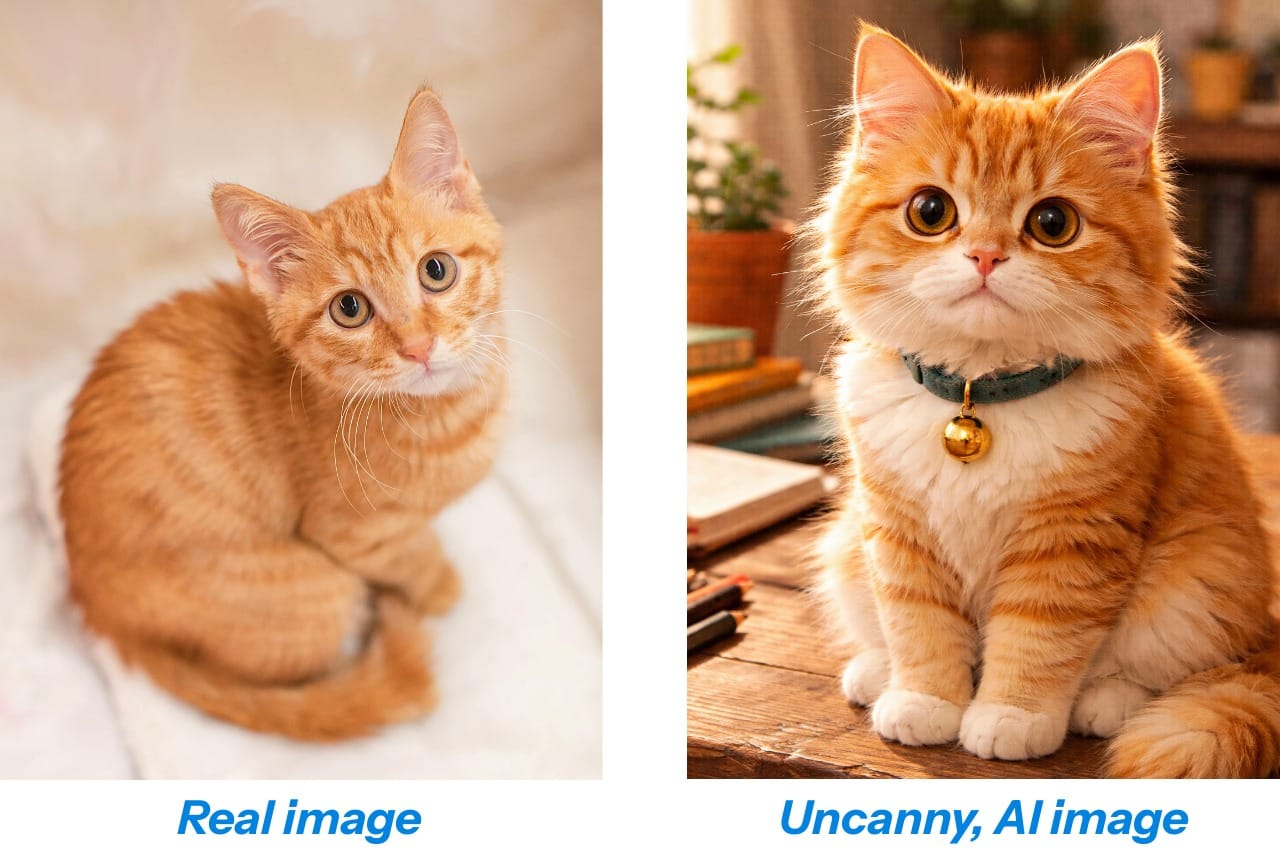 In the example above, the AI-generated image of a cat lacks realistic facial proportions — the eyes are too large, the muzzle is underdefined, and the symmetry is exaggerated. As a result, the cat appears more like a cartoon or plush toy than a real animal, breaking the sense of realism despite surface-level texture.