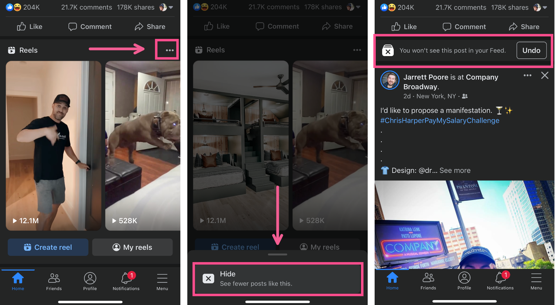 Hiding Facebooks Reels does two things: 1) It immediately hides that specific post from your Feed so you won't see it anymore. 2) It tells the Facebook algorithm not to show you similar posts in future.