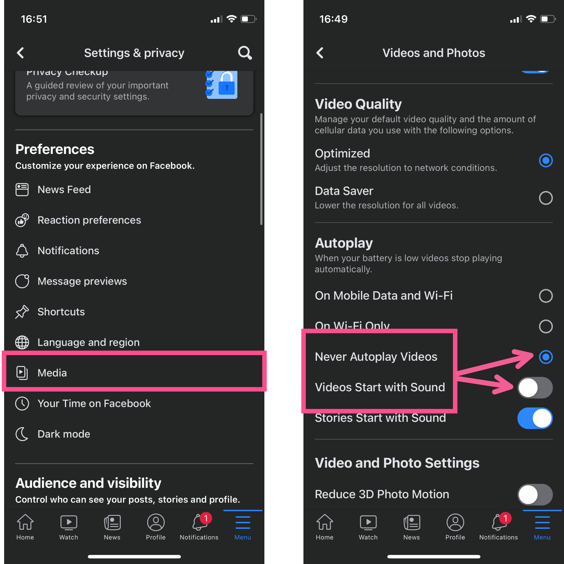 Scroll down to the "Media" button under Preferences. From here, check the bubble next to "Never Autoplay Videos" and make sure "Videos Start with Sound" is toggled off.