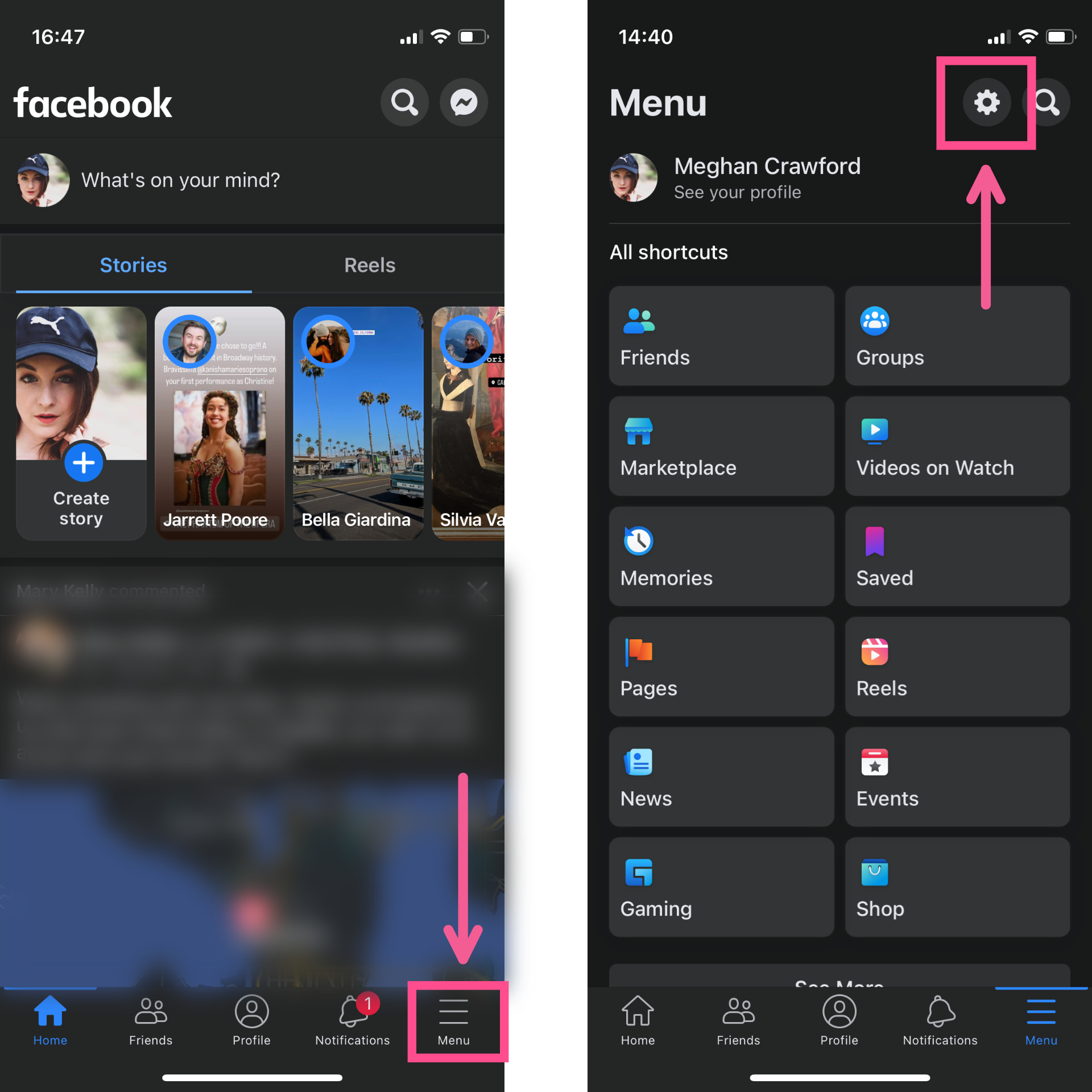 To turn off autoplay on Facebook Reels, navigate to the Menu tab in the app. This will take you to your profile settings and preferences menu. Tap the settings gear in the upper right hand corner.