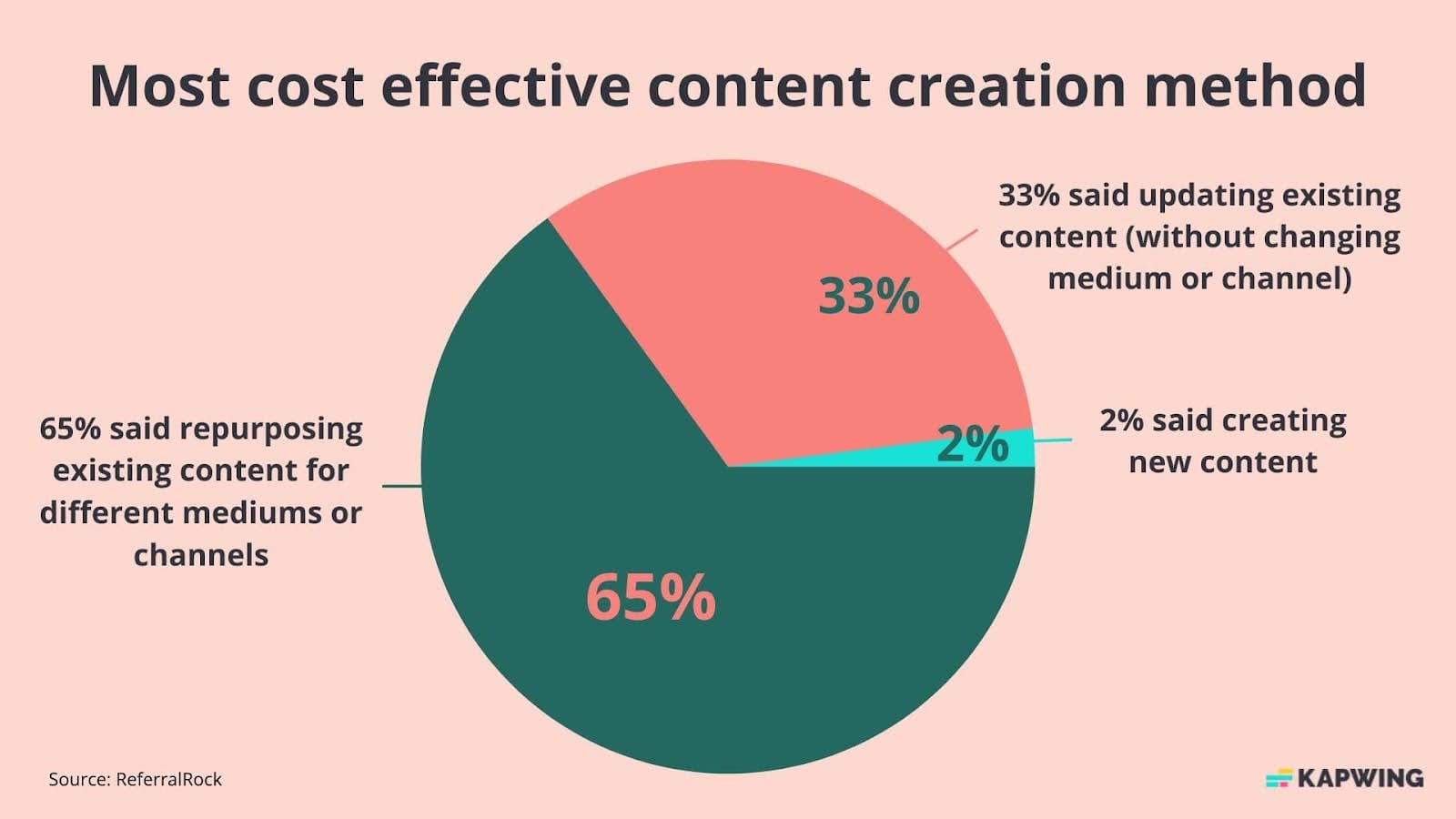 Marketers also agreed that content repurposing was the most cost-effective strategy, with 65% saying so. By comparison, only 2% said the same about creating new content, and 33% picked updating existing content.