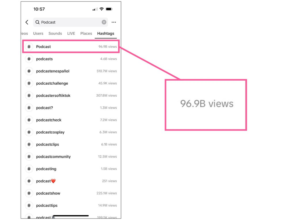 Once you have your podcast as a video, you can cut it into shorter clips to share on social media. TikTok in particular is a fantastic place to post podcast clips. On TikTok, the tag #podcast has 96.9 billion views on TikTok, and #podcasts has 4.6 billion views. Many of these clips have gone viral on the platform.