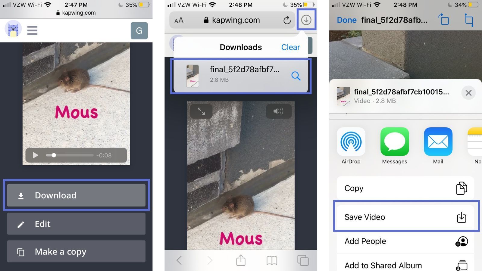 If you're on an iPhone, there are a couple more steps to get the video to your Camera Roll – tap the arrow in the top right corner and click your video, then tap the icon in the bottom left corner, scroll through the options, and select Save Video.