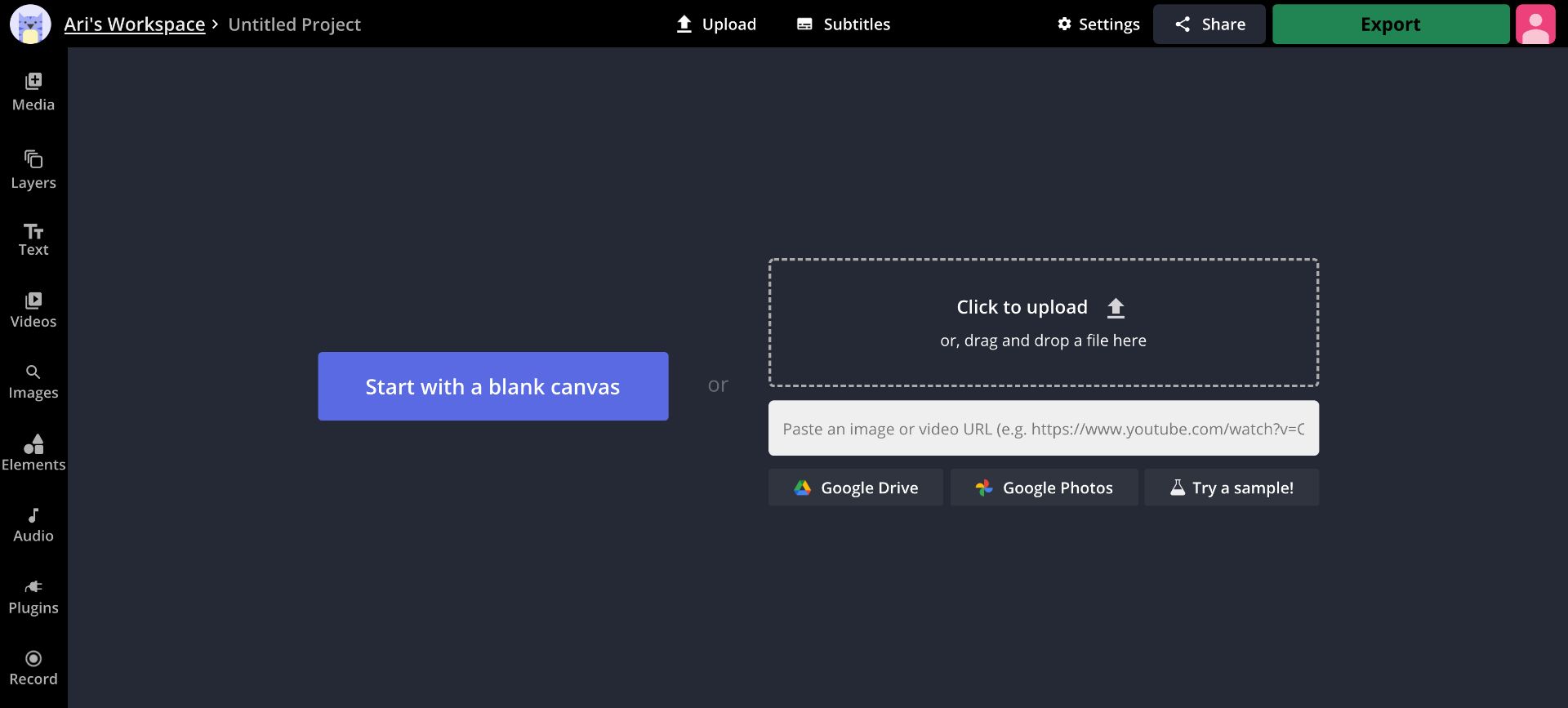 Once you found your media, head over to Kapwing.com and click the Start Editing button to enter the Studio. In the Studio, you can drag & drop your file right into the window, click the Upload button and find it on your device, or paste a link to your photo, video, or GIF.