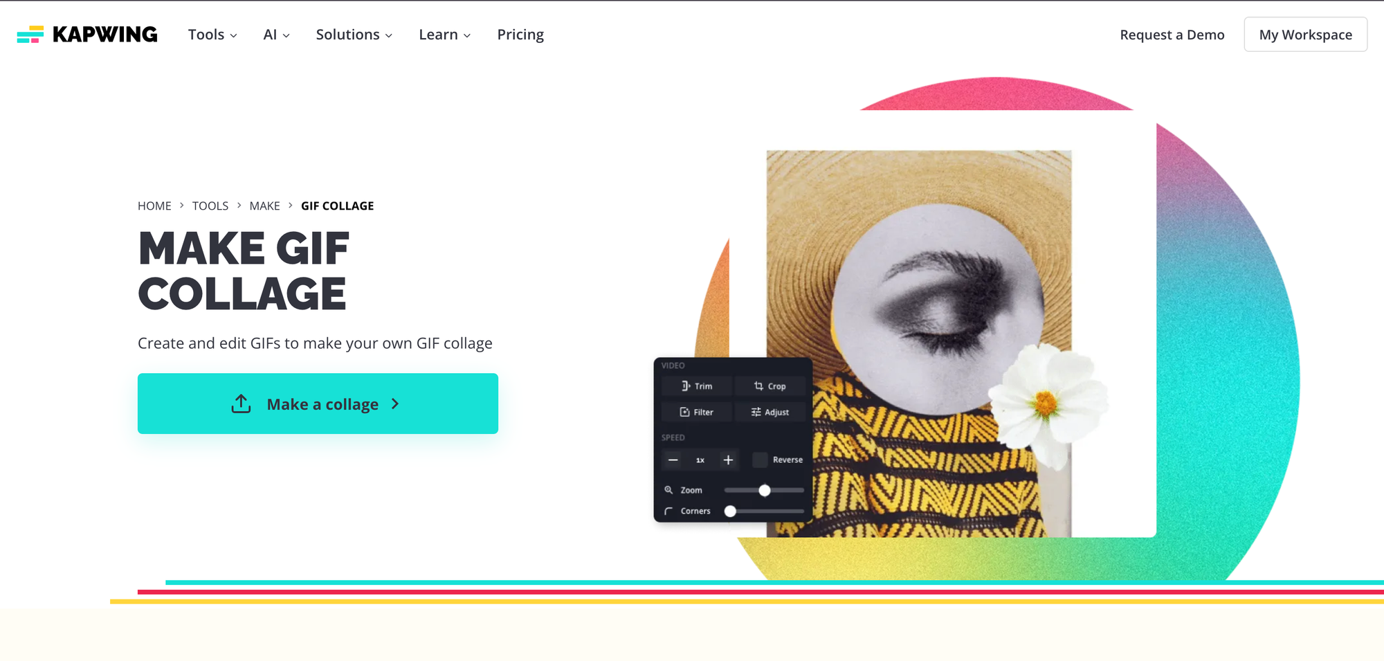 Open Kapwing’s Collage Maker to start your GIF collage. Kapwing is a free, easy, and accessible tool for making GIF collages. Start making a custom collage by clicking "Make a collage." Kapwing is a website, so it works on your phone or computer and you don’t need to download any software.