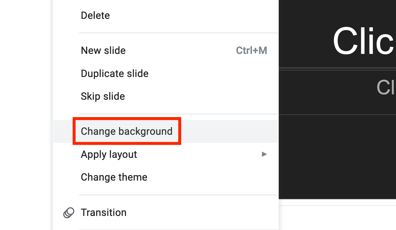 On the left-side of your screen, you’ll see the slides in your project so scroll down to whichever one you are wanting to add the background to. Now, you want to right-click the slide to pull up a small menu. Select Change background to open a new window.