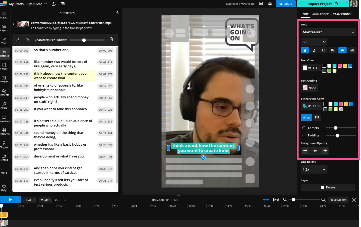 Click the Subtitles tab in the left-hand side bar and then click "Generate Subtitles." It'll take a little while to process and transcribe the subtitles. When it's ready, you'll be able to see the full transcript on the left as well as the captions on the video preview.