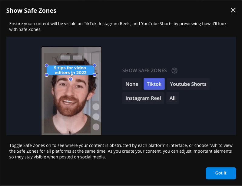 Safe Zones shows you a preview of how your clip will look on a social media platform by placing a transparent overlay over your video in the editor. Whatever's not covered by the overlay is a "safe zone" to add on-screen text, animations, autocaptions, and any other elements you want viewers to see.