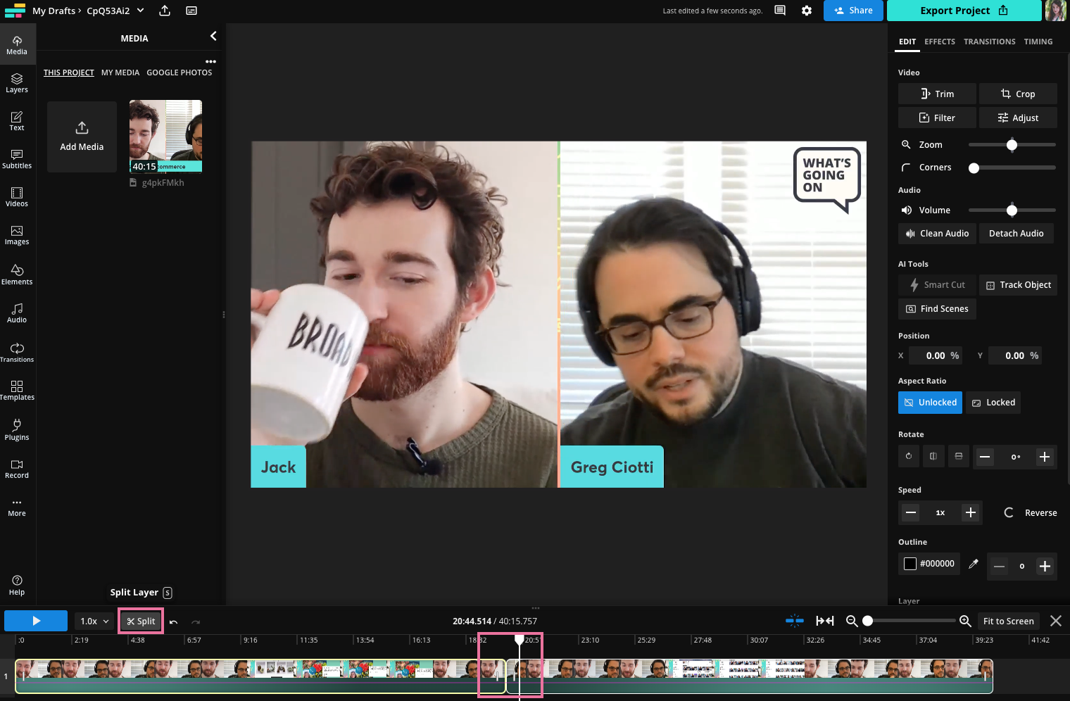 Once you've got your video uploaded, find your first clip in the timeline. Use the Split tool to mark the beginning and end of the clip and separate it from the rest of the footage.