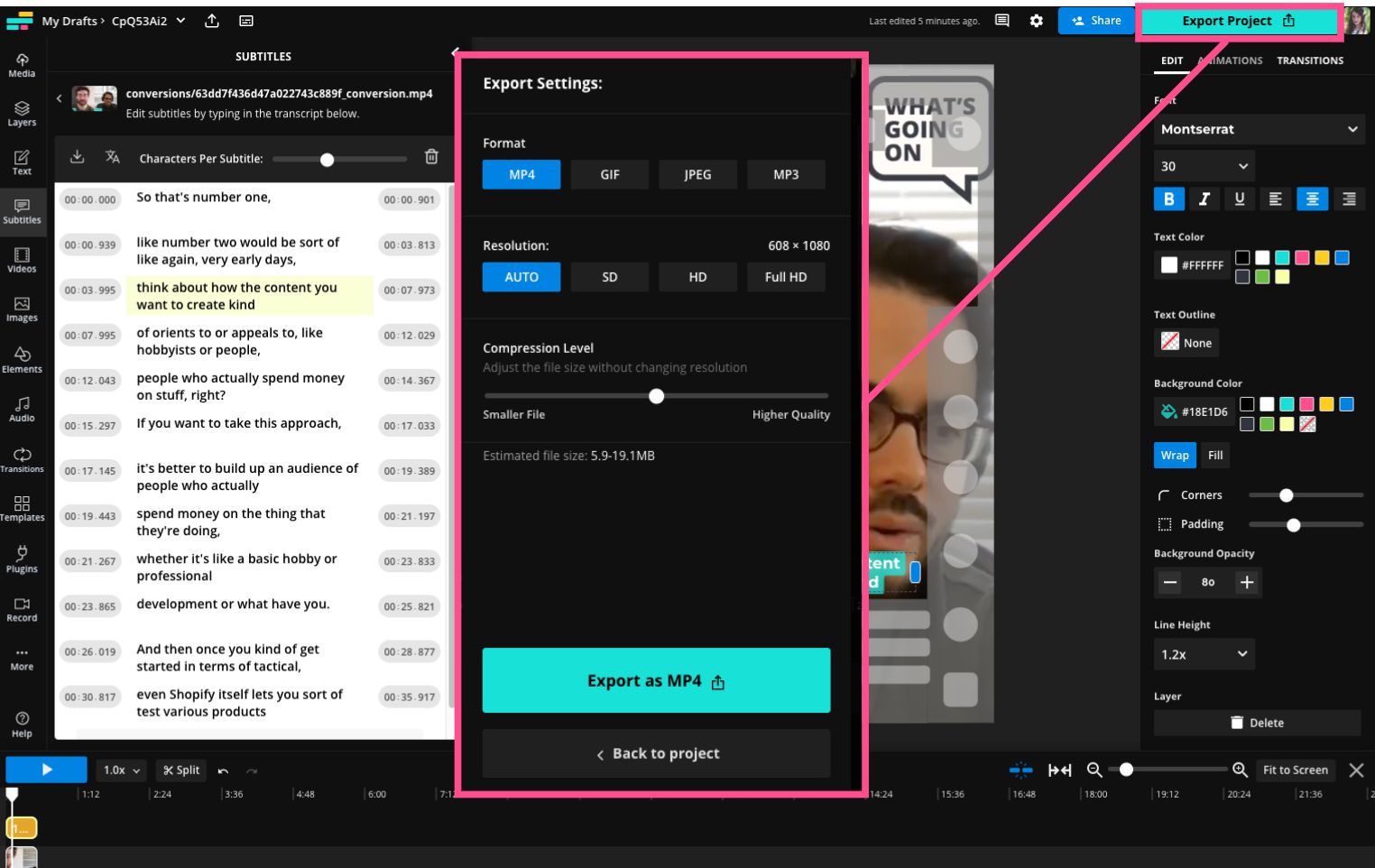 At this point, I recommend adding captions using the Magic Subtitles tool. It's not mandatory but frankly, it's 2023 and if you're not adding captions to your social video, what are you doing?