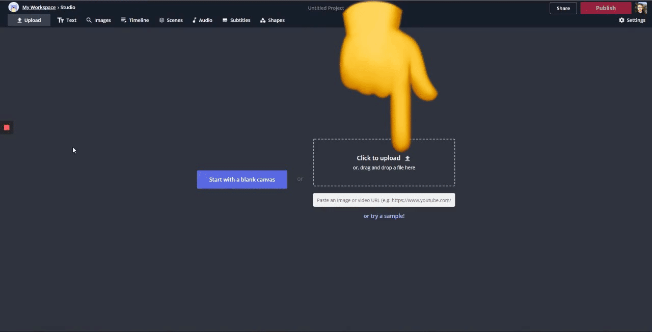 First, open the Kapwing Studio and upload your video. You can search the file, drag and drop or paste the link to open the video.