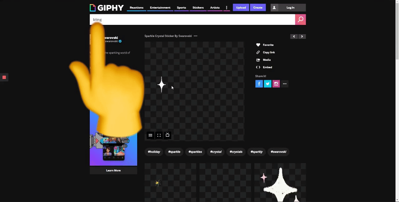 Now, go to Giphy.com and search their database of GIFs for a bling effect. In this example, I searched ‘bling’, found one that looked okay and finally chose a suggested effect. When you’ve found one, copy the link and head back to the studio.