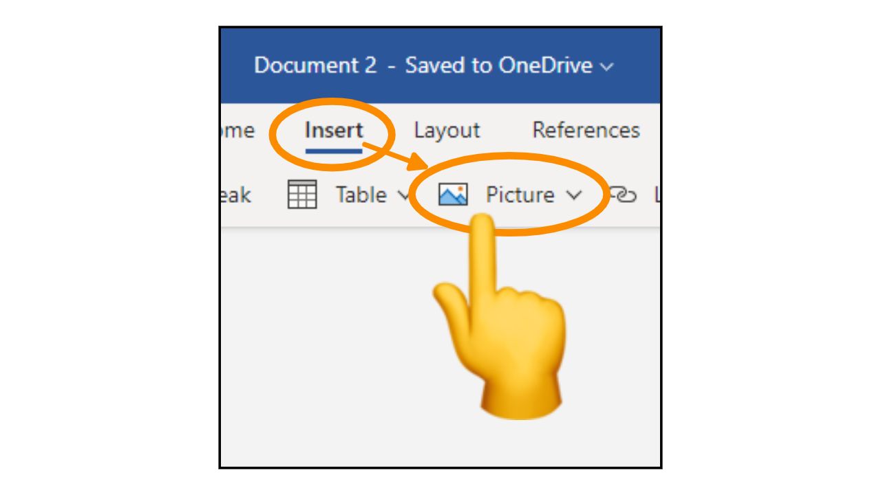 First, open your Word doc and click the ‘Insert’ tab from the top. Next, choose ‘Picture’ and upload the picture from your device, OneDrive or Bing Pictures.