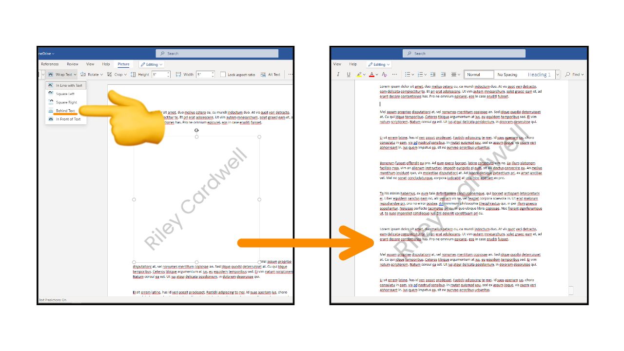 Now, the image will break up your text. At this point, make sure to drag the image where you’d like it to appear in the document and drag the corners to make it fit the page. Once you’re satisfied, click ‘Wrap Text’ from the toolbar and change it to ‘Behind Text.’