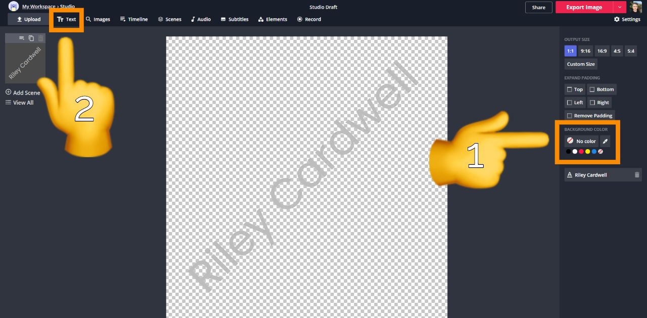 First, open the Kapwing studio and click ‘Start with a blank canvas.’ Next, change the background color to transparent with the menu on the right. If you want to make a text watermark, click ‘Text’ from the top, write the message and edit the color and formatting. For text, I recommend changing the color to gray and rotating the block diagonally to fit the length of the square.