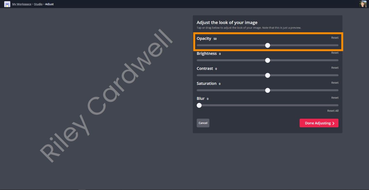 After you’re finished formatting, click ‘Export Image’ in the top right and download your watermark. Before you go back to Word, reupload this watermark to Kapwing. Once it’s up, you can click the image and choose ‘Adjust’ from the editing menu to change the opacity. To make sure your mark isn’t distracting, I recommend an opacity of 25 or less.