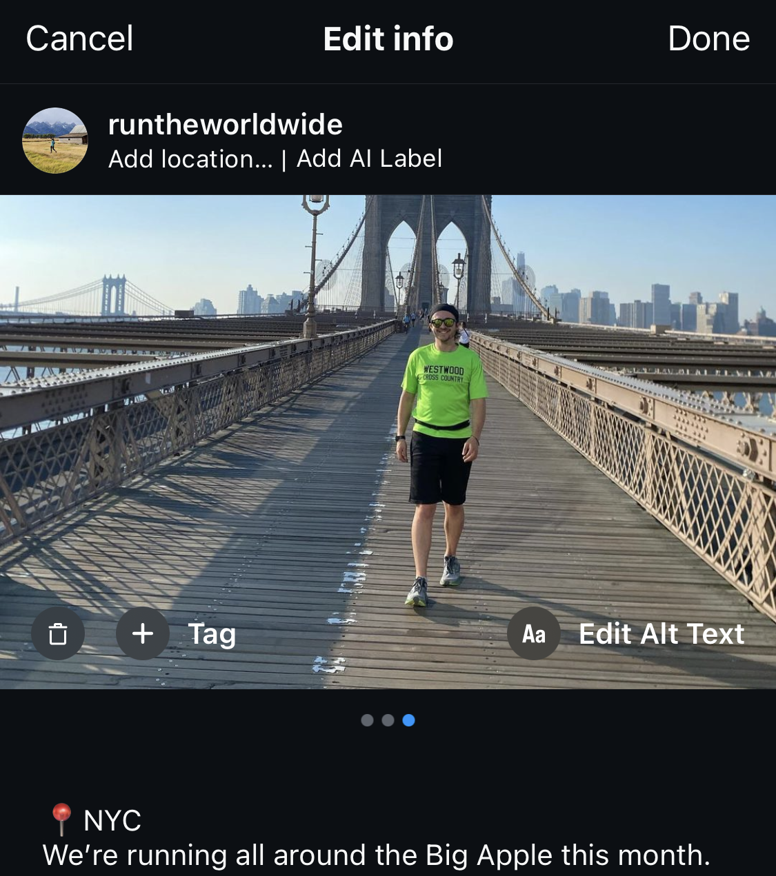 Once you post the gallery of images, the title of the song will appear just under your username, in the same area as the location tag, with a music note icon. The location and song name will rotate every few seconds so that someone can see what music is tagged to your post. If someone clicks on the song, they can "View audio details" to see other posts with that music, save, and share the tune.