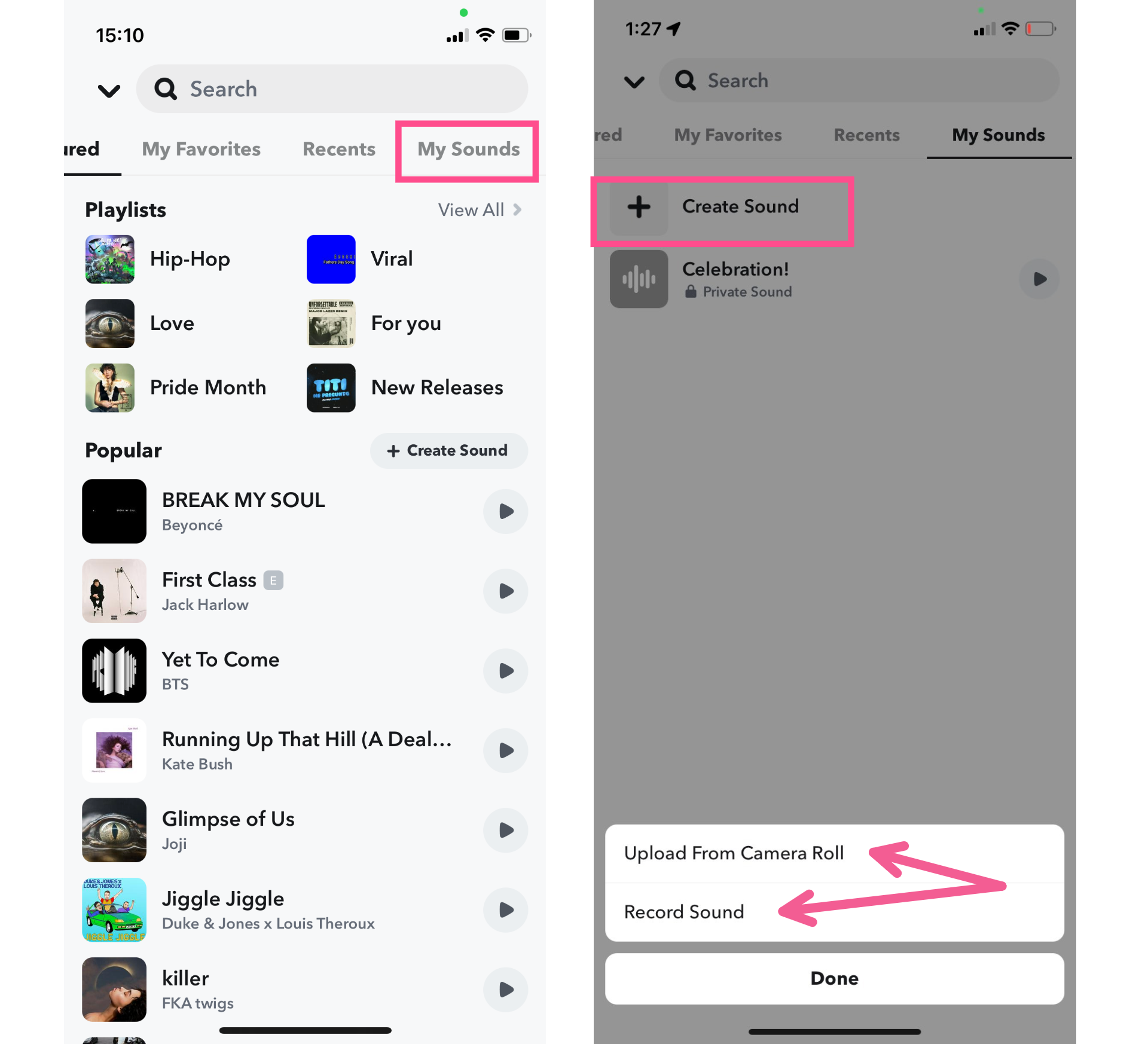 The “My Sounds” feature in Snapchat allows you to upload audio from your camera roll, then insert it into your Snap.