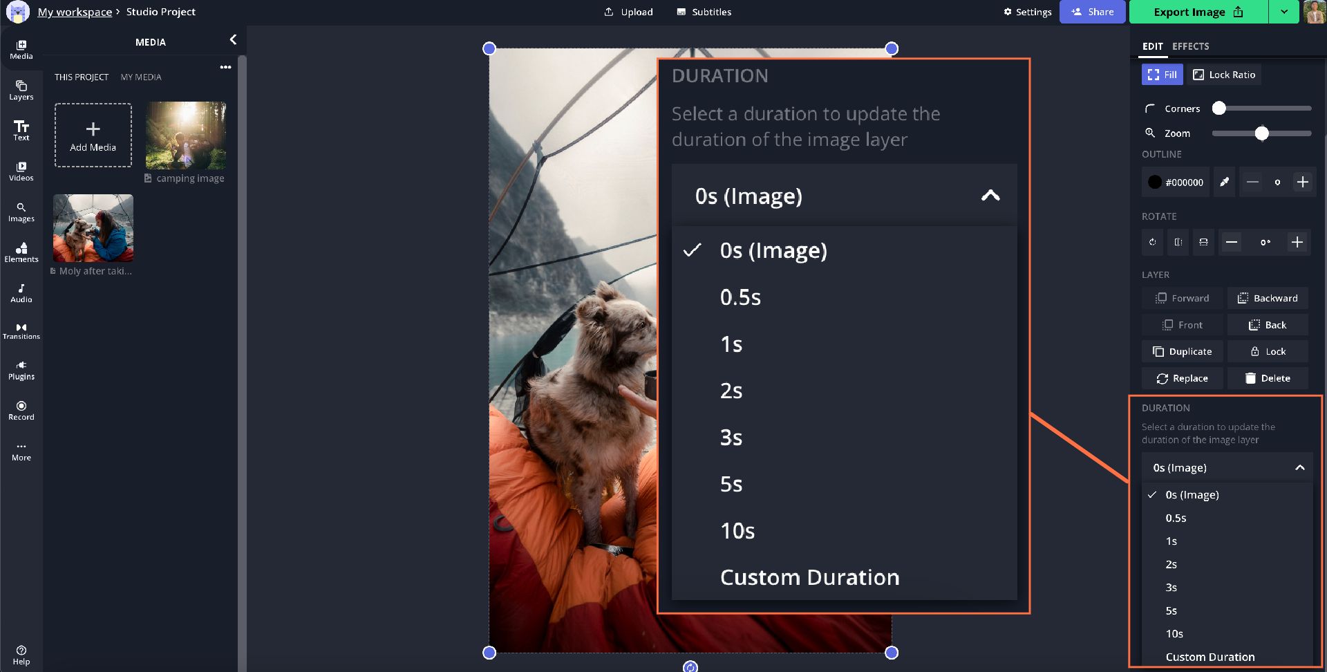 Once you've uploaded the pictures you want to use, click on any of them on your canvas and click on the "Duration" dropdown menu in the right sidebar.