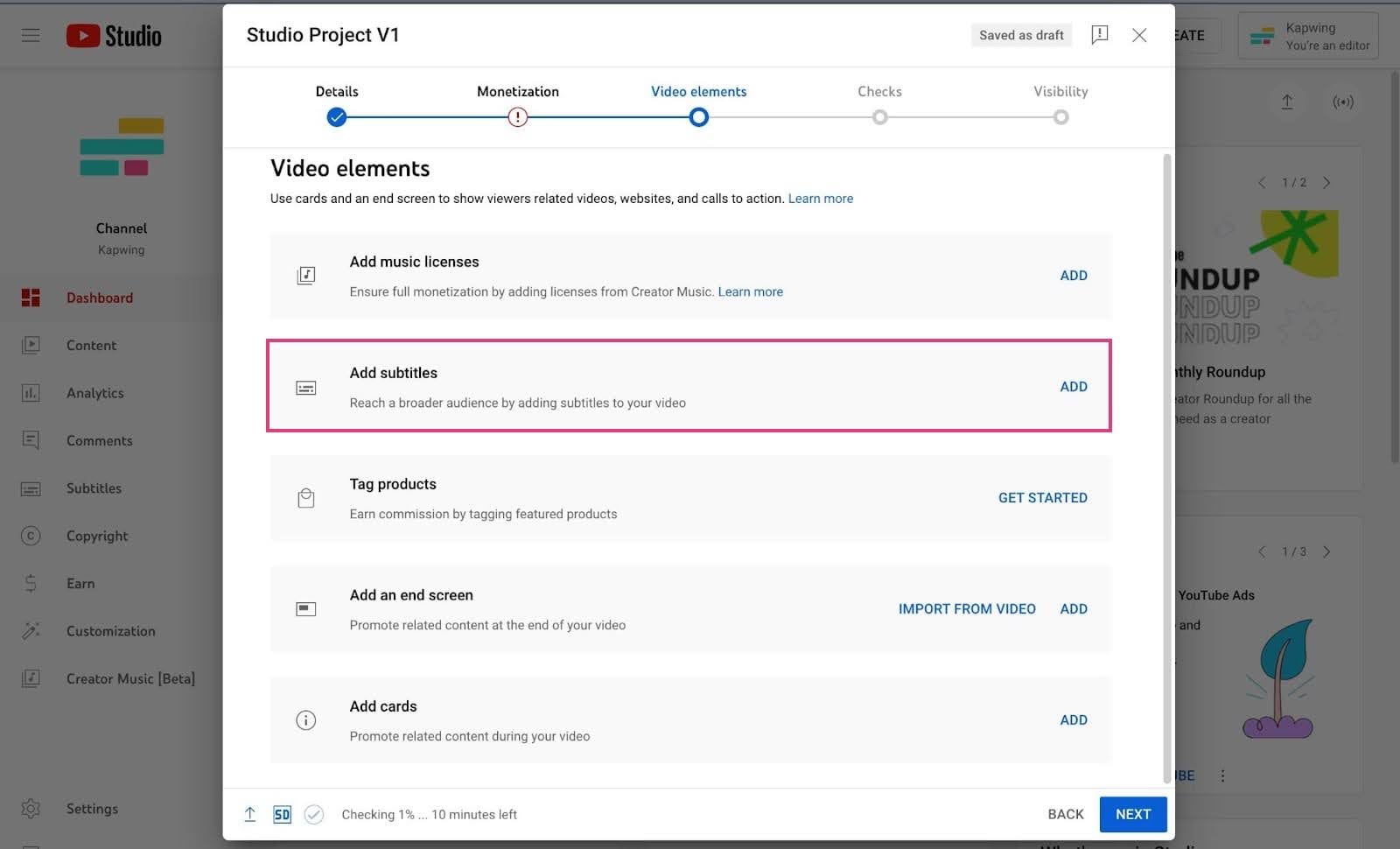 Upload your video to the YouTube Studio as usual and add the video description, details, and thumbnail. Proceed to the “Video elements” step of the upload process and click on “Add subtitles.”