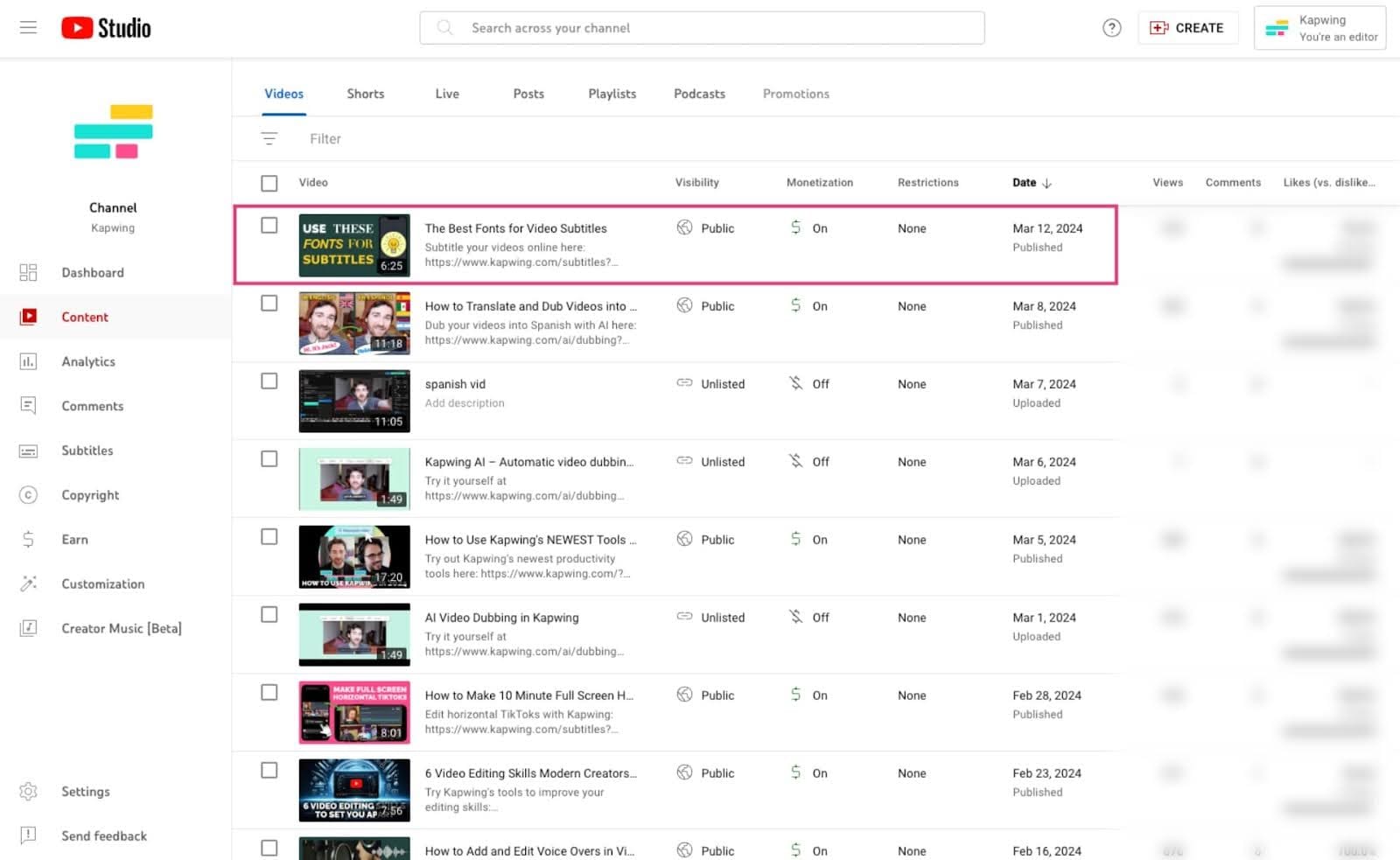 First, navigate to the YouTube Studio. Open the “Content” tab and find the video you want to edit. If this is your most recently published video, it’ll be at the top of the page.